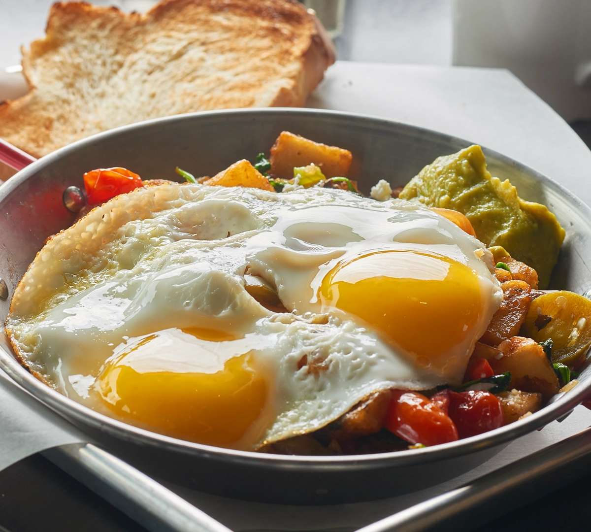 sunny side up eggs, home fries, peppers, onions, spinach, mushrooms, cherry tomatoes, avocado, jalapeño, feta cheese, challa toast