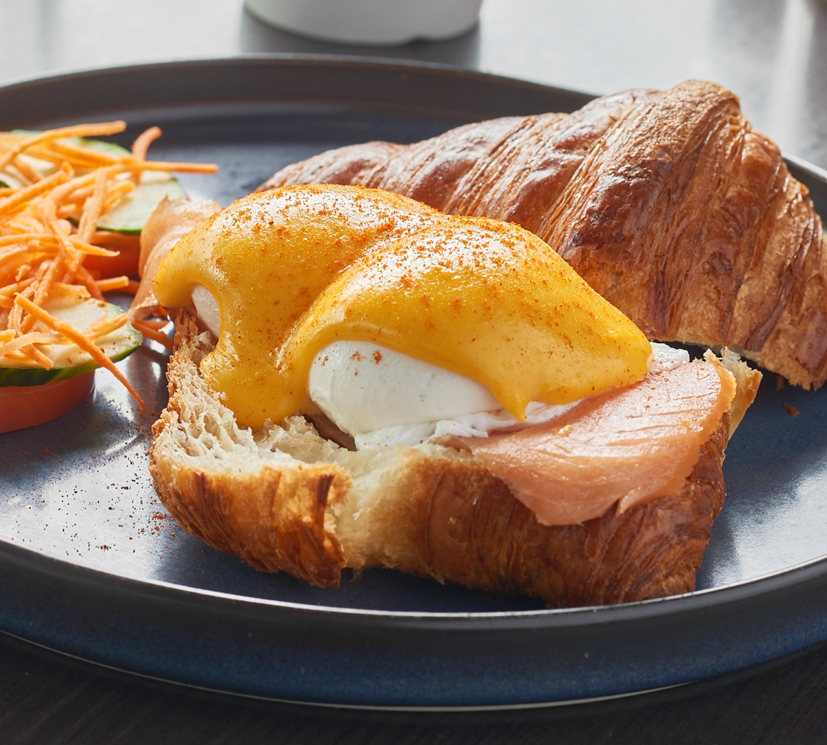 butter croissant, medium poached eggs, cream cheese, smoked salmon, hollandaise sauce