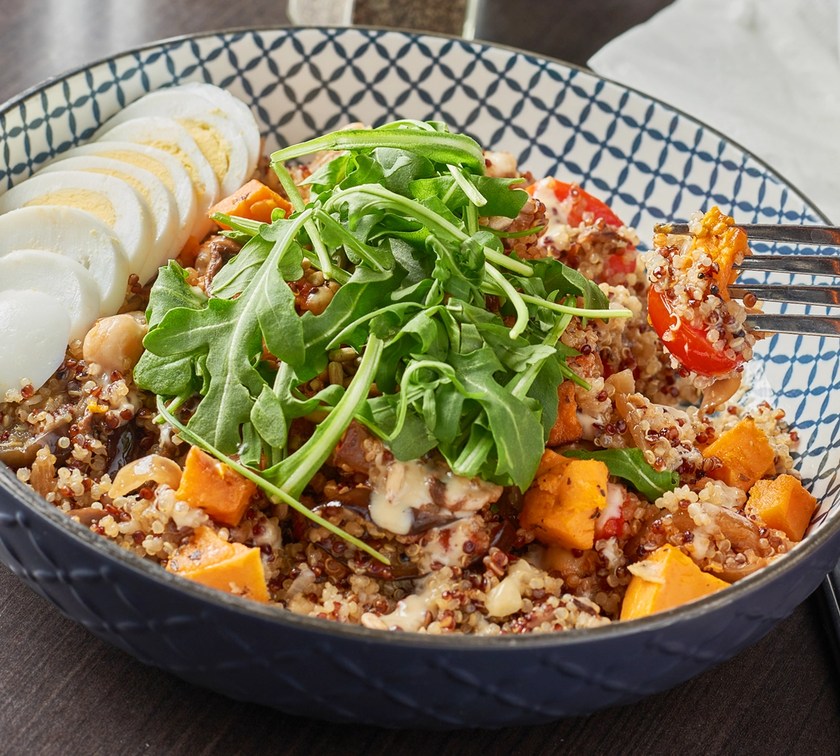 quinoa, chick peas, matbucha, mushrooms, onions, roasted eggplant, batata, hard-boiled egg, hummus, pumpkin seeds, tahini