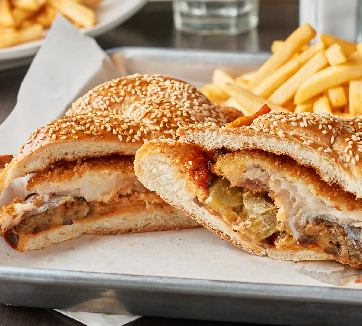 challa bun, matbucha, roasted eggplant, jalapeño, pickles, tahini